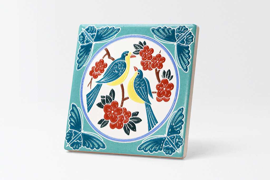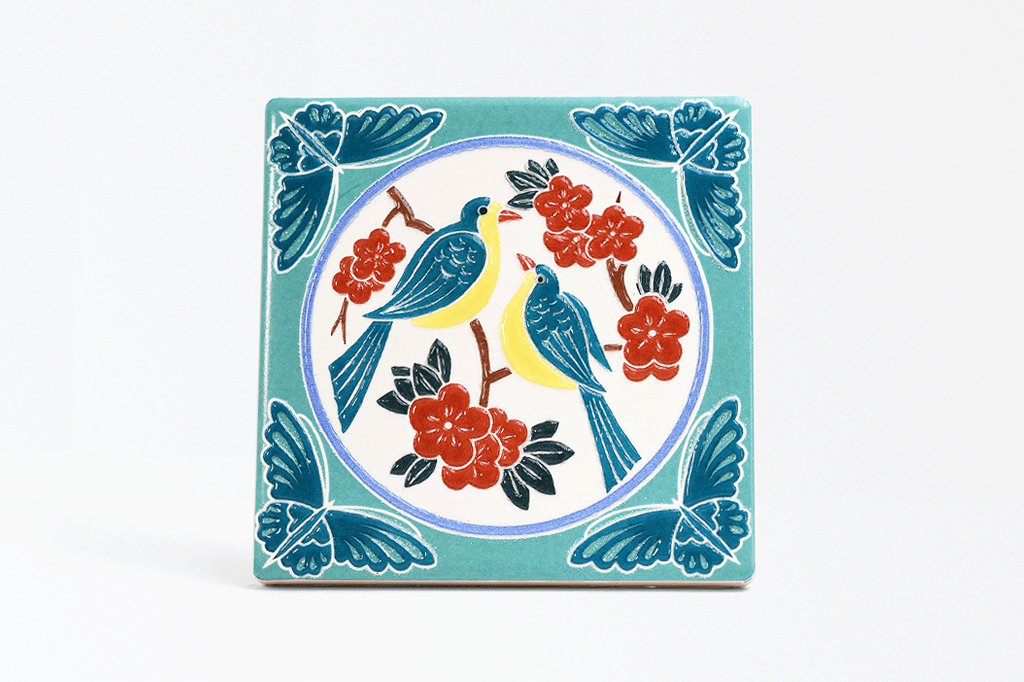 喜鵲在梅樹梢上嬉戲,蝴蝶自四角翩然而至,象徵雙喜(鵲)賜福(四蝴)。